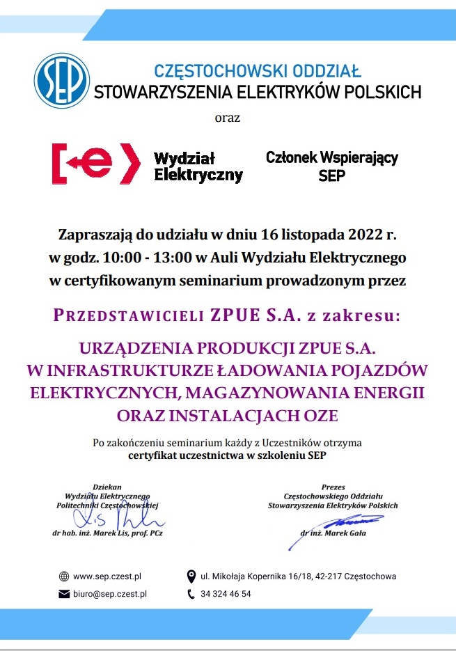 Serdecznie zapraszam Członków i Sympatyków Częstochowskiego Oddziału SEP do udziału w zaplanowanym na dzień 16 listopada 2022 r. w godz. 10:00 – 13:00 w Auli Wydziału Elektrycznego Politechniki Częstochowskiej certyfikowanym seminarium z zakresu: