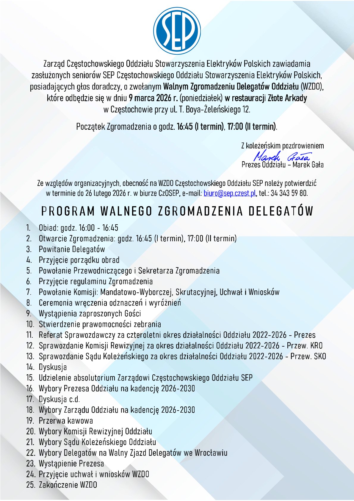 Zawiadomienie o zwołanym Walnym Zgromadzeniu Delegatów Oddziału (WZDO) Częstochowskiego Oddziału Stowarzyszenia Elektryków Polskich